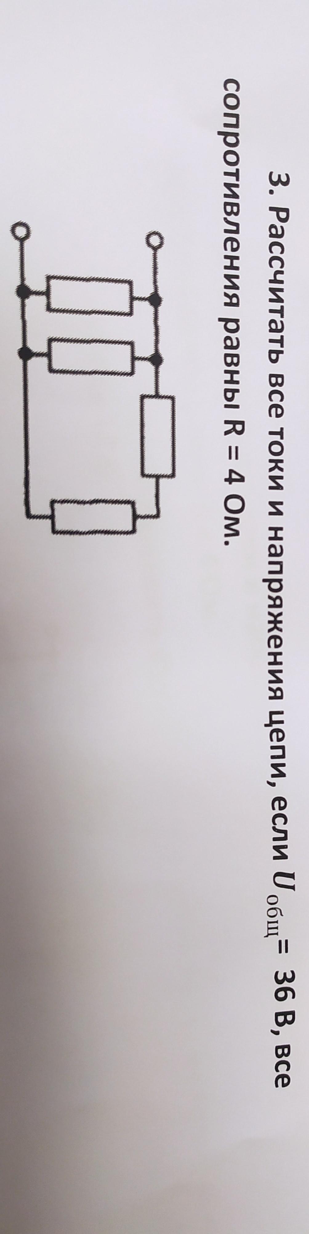 Рассчитать все токи и напряжения цепи, если U общ= 36 В, все сопротивления равны R = 4 Ом.