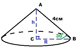 Образующая конуса AB = 4 см; ∠ABC = 30°