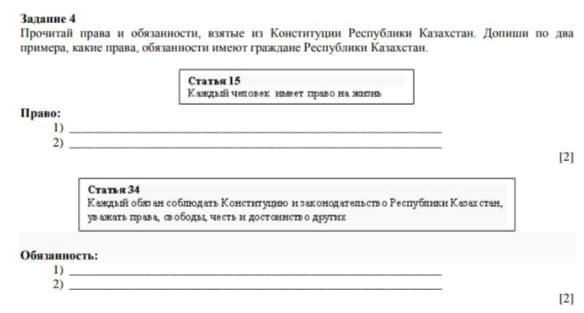прочитай права и обьязаности взятые из Констетуций Республики Казахстан. допиши по 2 примера какие права и обьязаности имеют граждание Республики Казахстана