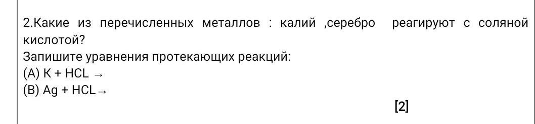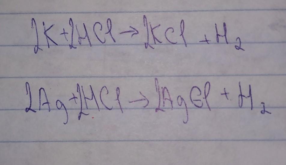 Даю 30 баллов! Какие из перечисленных металлов: калий, серебро реагирует с соляной кислотой?