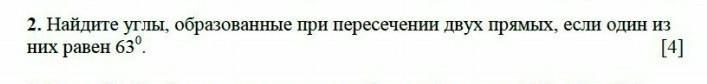 найдите углы, образованные при пересечении двух прямых, если один из них равен 63 градусов