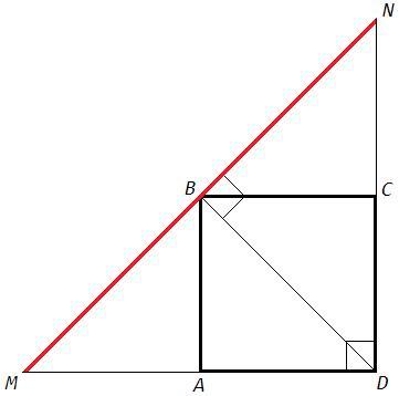 Через конечную точку B диагонали BD=15,3 ед. изм. квадрата ABCD проведена прямая перпендикулярно диагонали BD. Проведённая прямая пересекает прямые DA и DC в точках M и N соответственно.