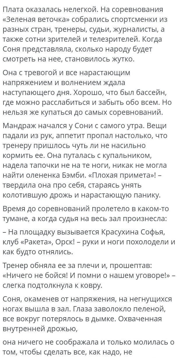 3. Тренер обняла её за плечи и, прошептав: "Ничего не бойся! И помни о нашем уговоре!" - слегка подтолкнула к ковру.