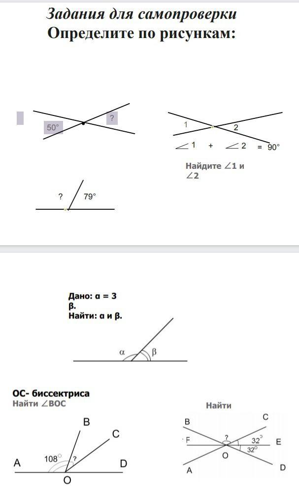 В первой задаче угол равен 50⁰. На рисунке снизу угол равен 101⁰, так как сумма смежных углов равна 180⁰. А на рисунке справа угол 1 равен 45⁰, и угол 2 равен 45⁰, так как вертикальные углы равны.