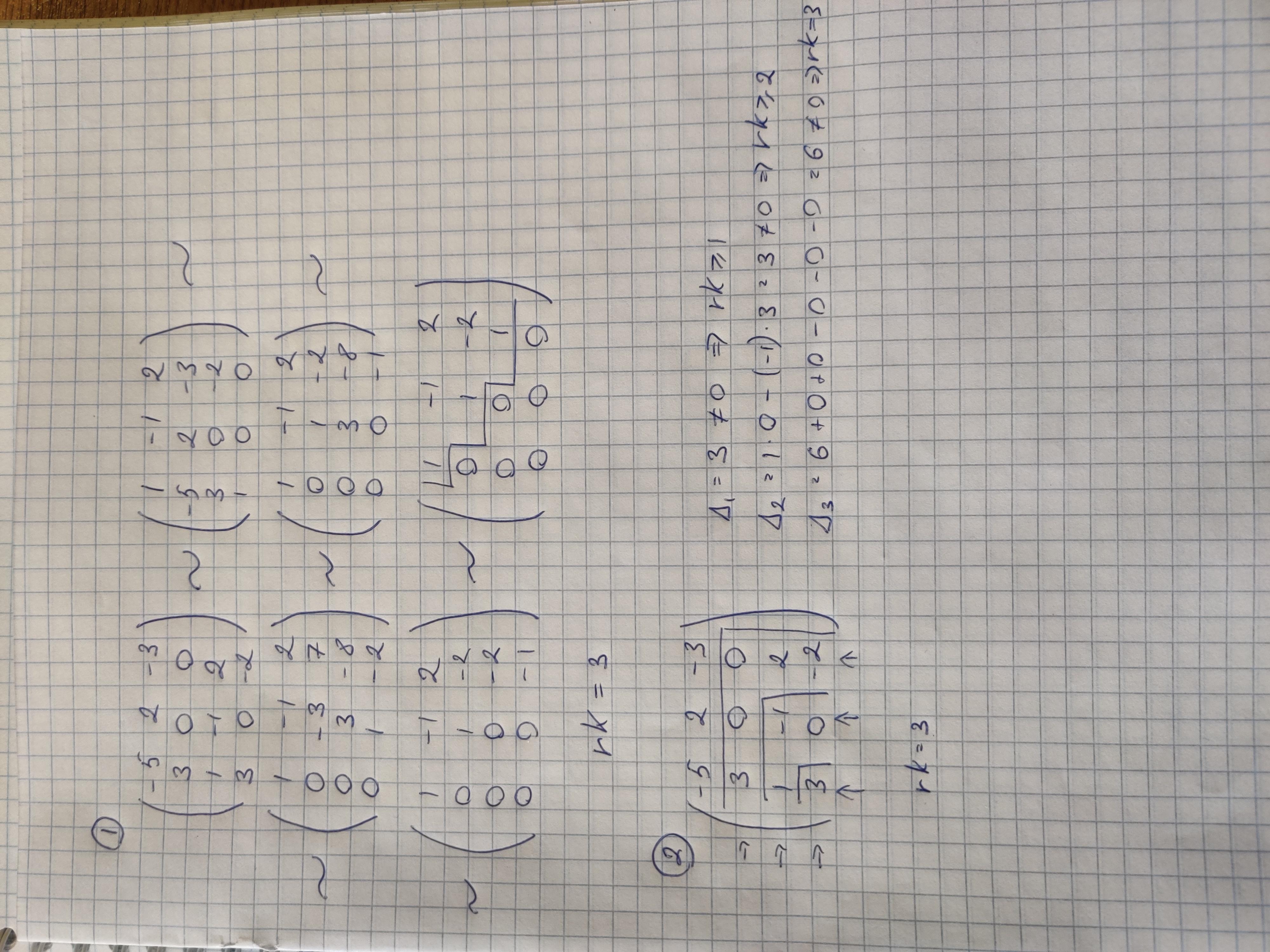 1. Ранг матрицы равен числу ненулевых строк в ступенчатом виде данной матрицы. Приводим к ступенчатому виду элементарными преобразованиями.