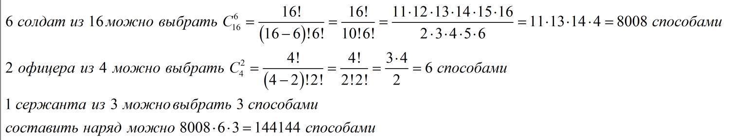 В роте 16 солдат, 4 офицера и 3 сержанта. На охрану объектов необходимо выделить 6 солдат, 1 сержанта и 2 офицера. Сколько существует вариантов составить наряд?