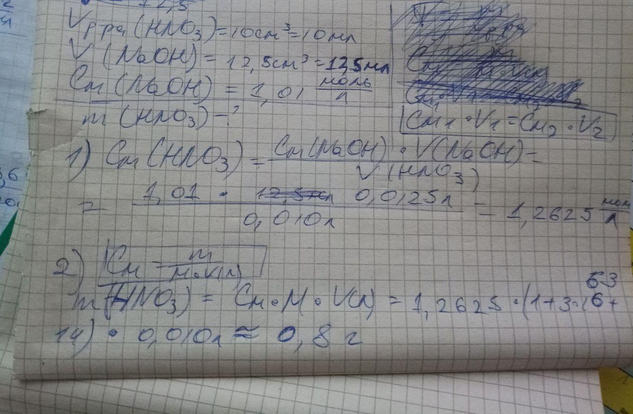 Вычислить массу азотной кислоты HNO3 в 10 см^3 её раствора, если на титрование этого объема раствора израсходовано 12,5 см^3 1,0100М раствора NaOH.