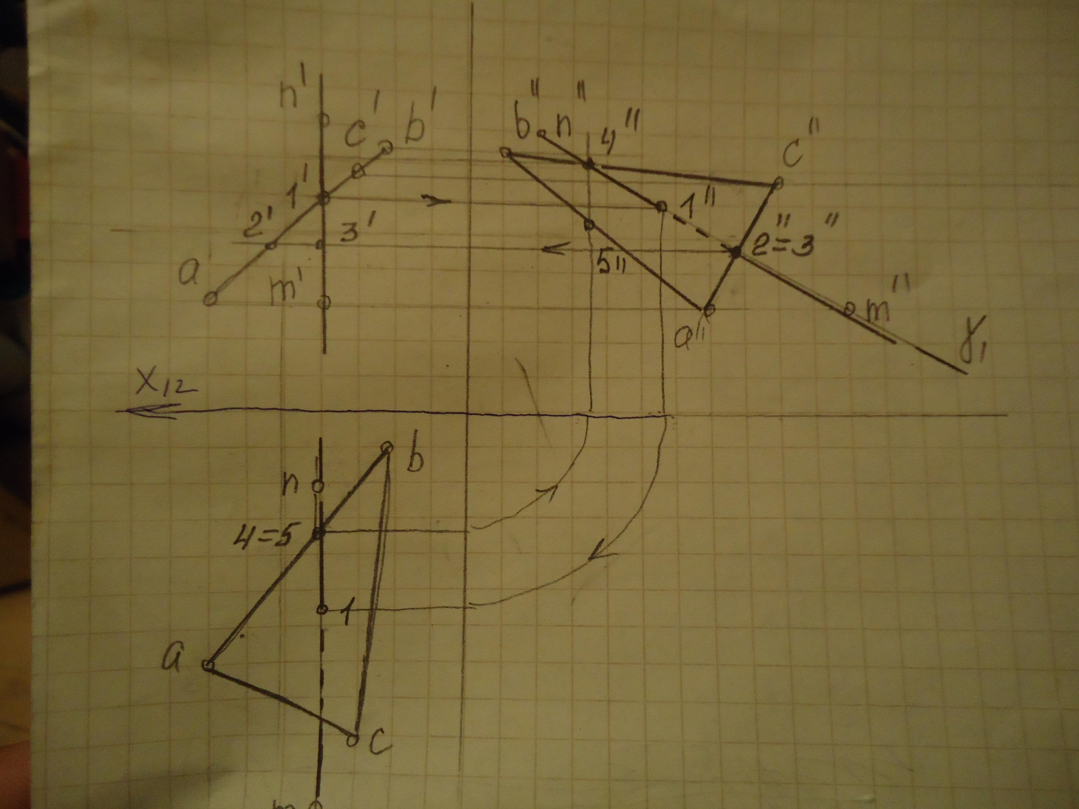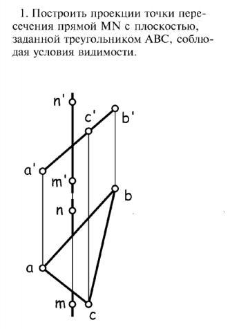 Построить проекции точки пересечения mn с плоскостью, заданной треугольником abc, соблюдая условия видимости.