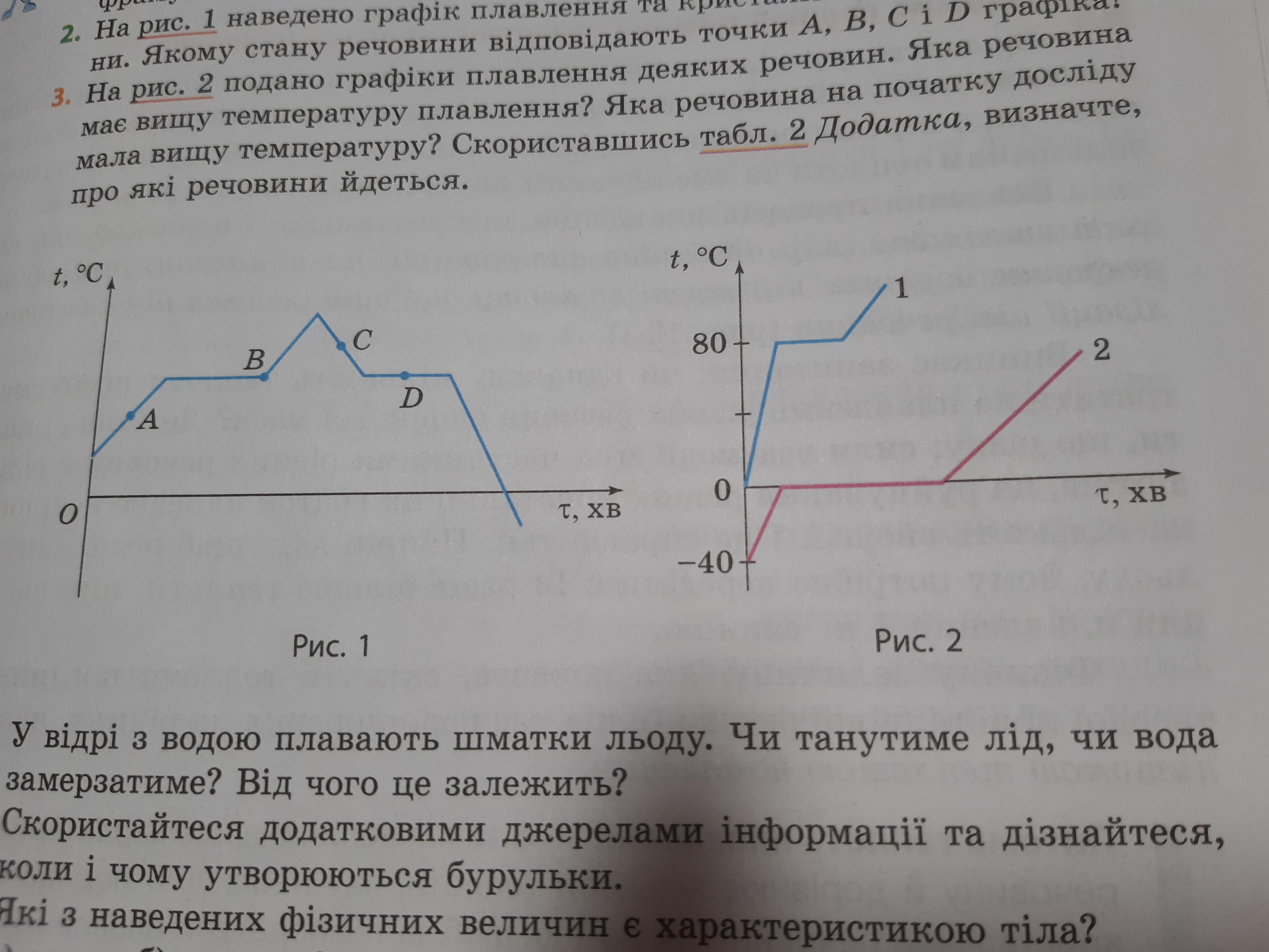 2. На рис. 1 наведено графік плавления та кристалізації деякої речовини. Якому стану речовини відповідають точки А, В, С і D графіка? 3. На рис. 2 подано графіки плавлення деяких речовин. Яка речовина мае вищу температуру плавлення? Яка речовиня на початку досліду мала вищу температуру?