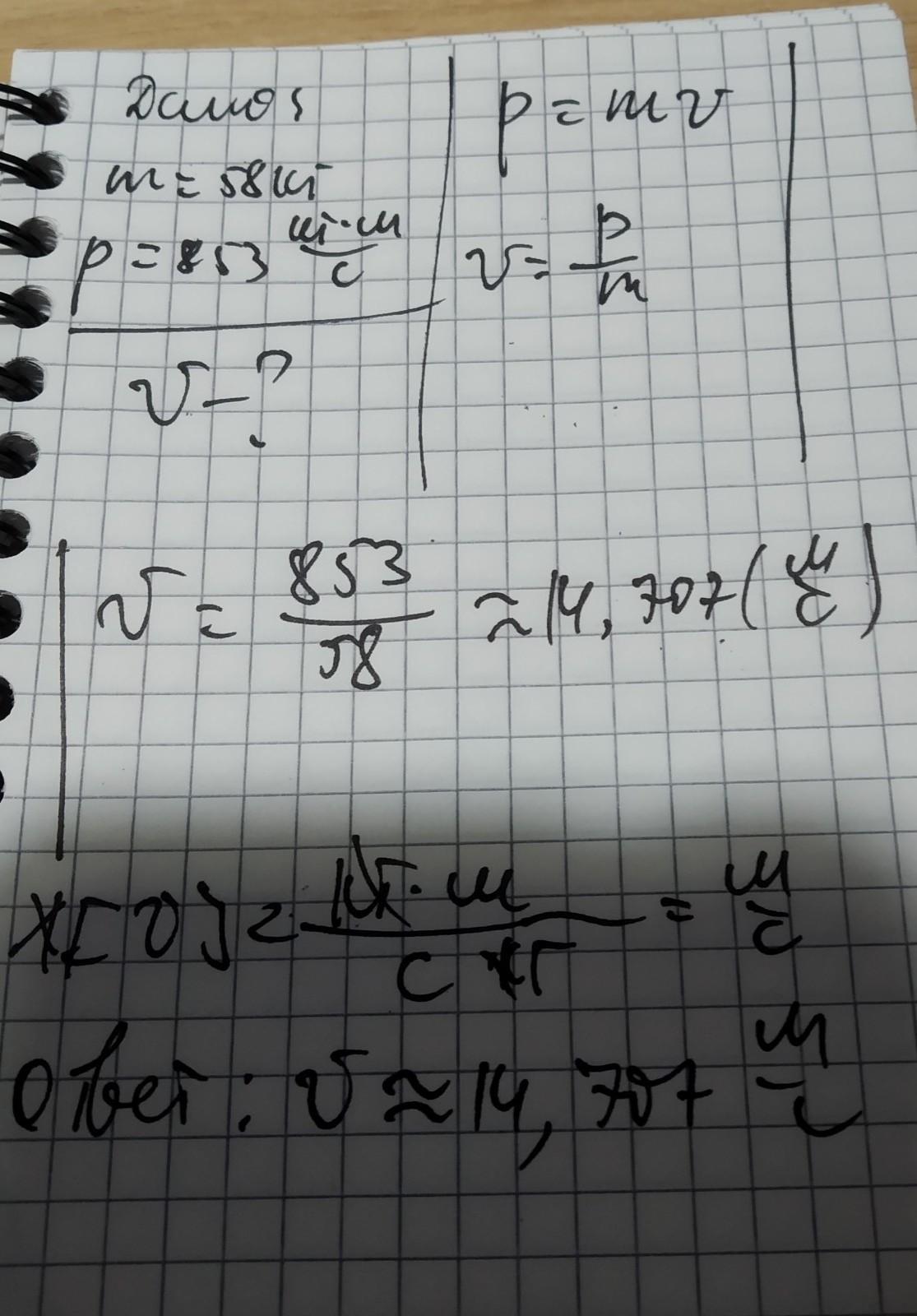 Лодка массой 58 кг имеет импульс, модуль которого равен 853 кг·м/с. Вычисли скорость лодки. Выбери вариант ответа, наиболее близкий к правильному.