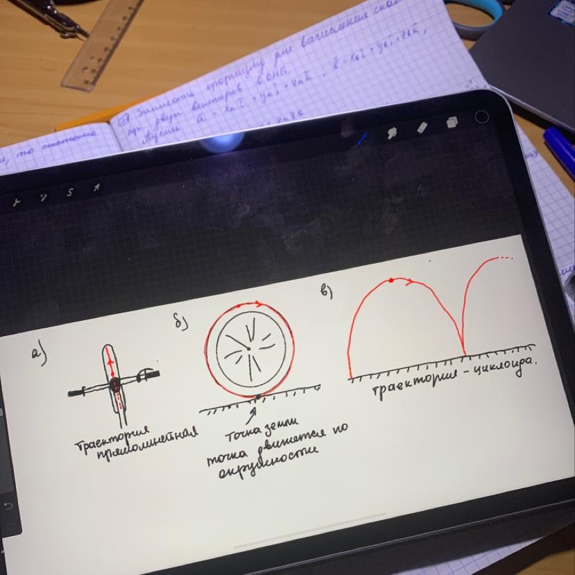 Школьник отметил красной краской точку на шине колеса велосипеда и поехал на нём по прямой дороге. Изобразите примерную траекторию красной точки относительно;