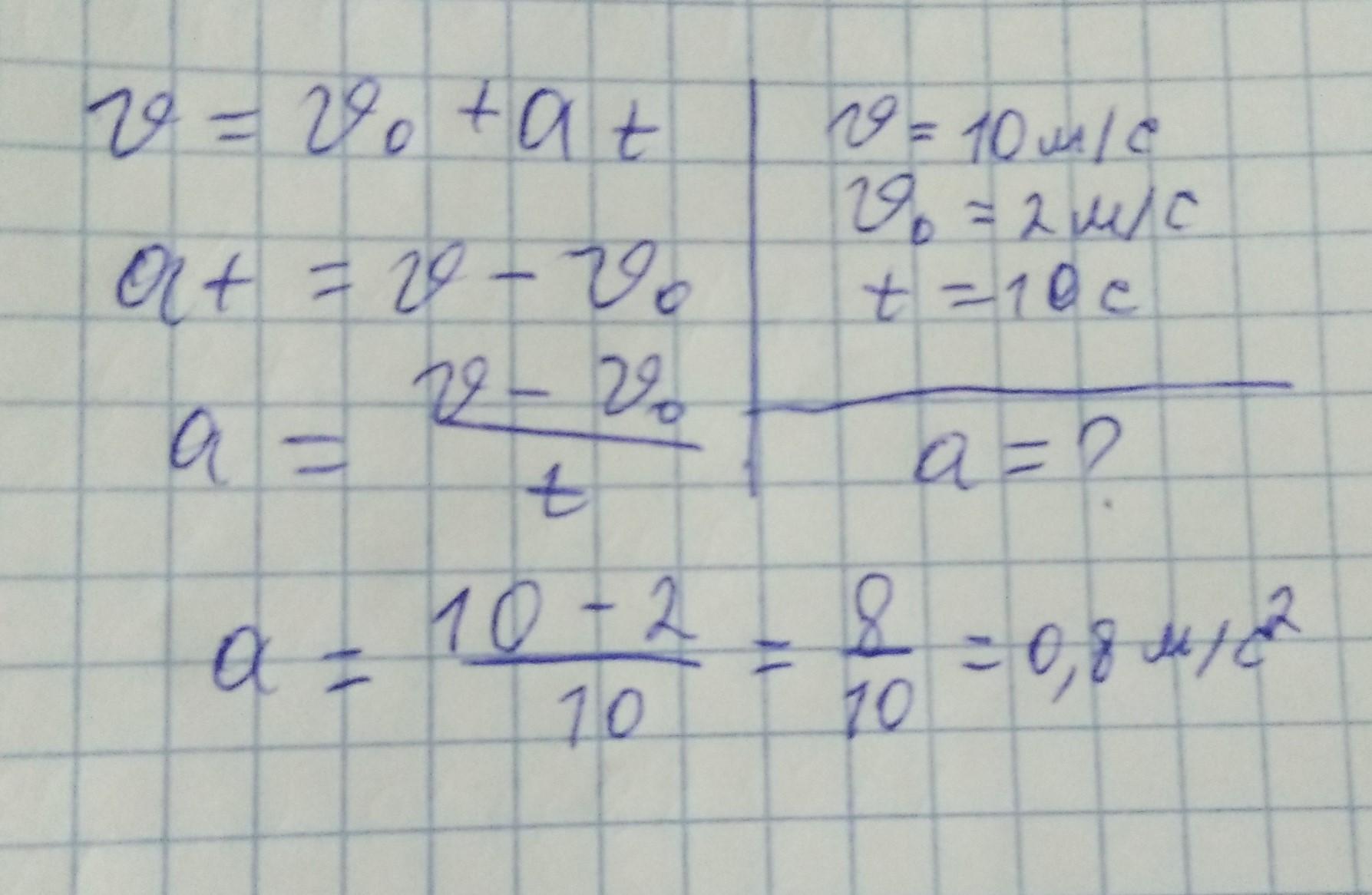 Скорость тела за 10 выросла с 2 м/с до 10м/с.Чему равно ускорение тела?