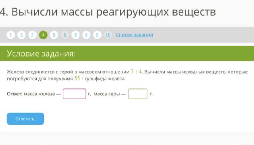 Железо соединяется с серой в массовом отношении 7:4. Вычисли массы исходных веществ, которые потребуются для получения 55 г сульфида железа.