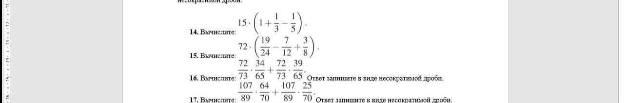 15) \frac{72}{73}  \times  \frac{34}{65}  +  \frac{72}{73}  \times  \frac{39}{65}  =  \frac{2448}{4745}  +  \frac{216}{365}  =  \frac{72}{65}  = 1 \frac{7}{65}