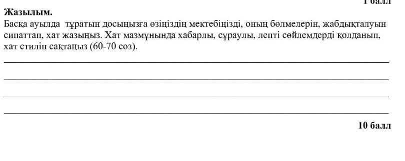 Сәлем!Досым қалың қалай? Ауыл калай? Қал жағдайларың жақсыма?Сендерді қатты сағындым! Менің бүгінгі хатымда саған көшіп келген мектебім туралы айтқым келіп отыр.Мектептің іші үлкен,бөлмелері кең әрі әдемі, жиһаздары ыңғайлы орналасқан екен.Мектепте керекті жабдықтардың бәрі бар, керемет екен! Есіңдеме досым?Зерртханалық жұмыс орындау үшін арнайы кабинетіміз болсағой деп армандайтын едіккой,бұл мектепте зертханалық бөлмеде керекті құрал-жабдықтарда бар екен.Дәл арманыма қол жеткендей шаттанып жүрмін.Сен біз жаққа келген кезде барлығын айтып беремін.Әзірге осы үй-ішіне сәлемімді жеткіз.Сендерді жақсы көремін.Құрметпен досың-... .Аман-сау болыңдар!