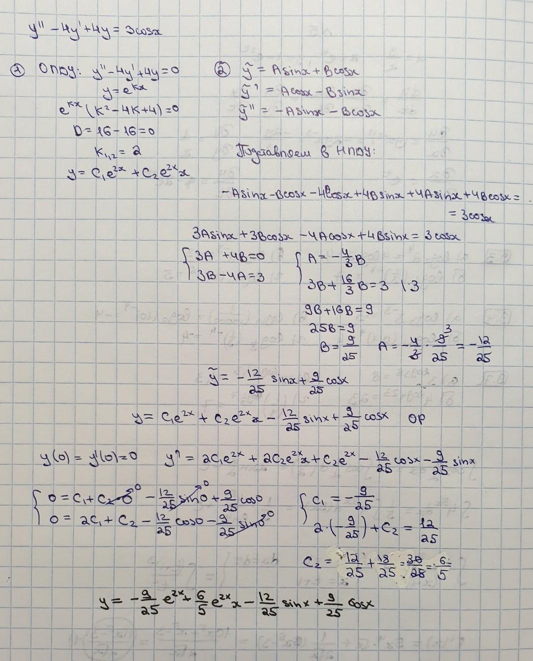 y'' - 4y' + 4y = f(x) где функция f(x) имеет следующий вид : 3cos x , y(0) = y' (0) = 0;