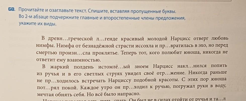 В жаркий(опред.) полдень(обстоят.) истомленный(опред.) зноем(дополн.) Нарцисс(подлеж.) наклонился(сказуем.) попить(сказуем.) из ручья(обстоят.) и в его(опред.) светлых(опред.) струях(дополн.) увидел(сказуем.) свое(опред.) отражение(дополн). Никогда(обстоят.) раньше(обстоят.) не приходилось(сказуем.) встречать(сказуем.) Нарциссу(дополн.) подобной(опред.) красоты(дополн.). И с этих(опред.) пор(дополн.) юноша(подлеж.) потерял(сказуем.) покой(дополн.). Каждое(опред.) утро(дополн.) он(подлеж.) приходил(сказуем.) к ручью(обстоят.), погружал(сказуем.) свои(опред.) руки(дополн.) в воду(обстоят.), ((мечтая обнять себя(деепричастный оборот)). Но все(подлеж.) было(сказуем.) напрасно(обстоят.).