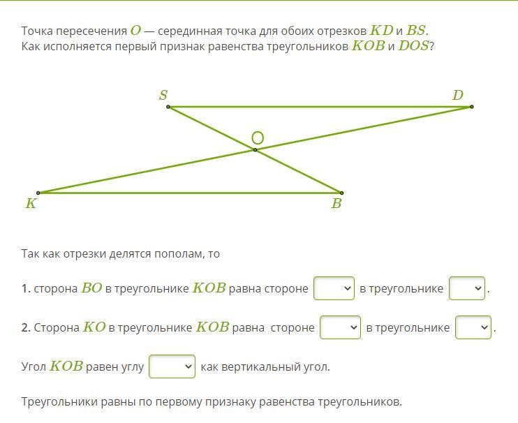 Как исполняется первый признак равенства треугольников KOB и DOS?