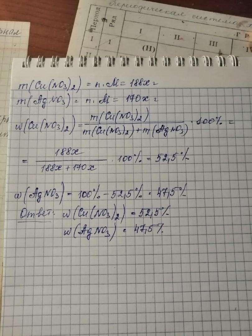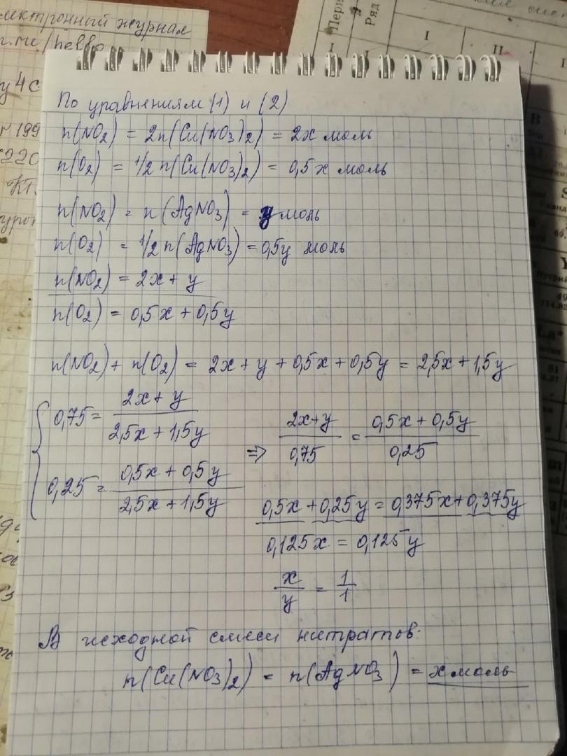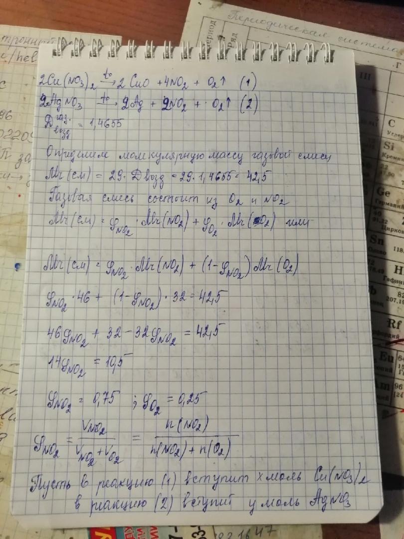При полном термическом разложении смеси нитратов серебра и меди образовалась газовая смесь (н.у.) с относительной плотностью по воздуху 1,4655. Необходимо найти массовые доли солей в первоначальной смеси. Ответ с полным решение