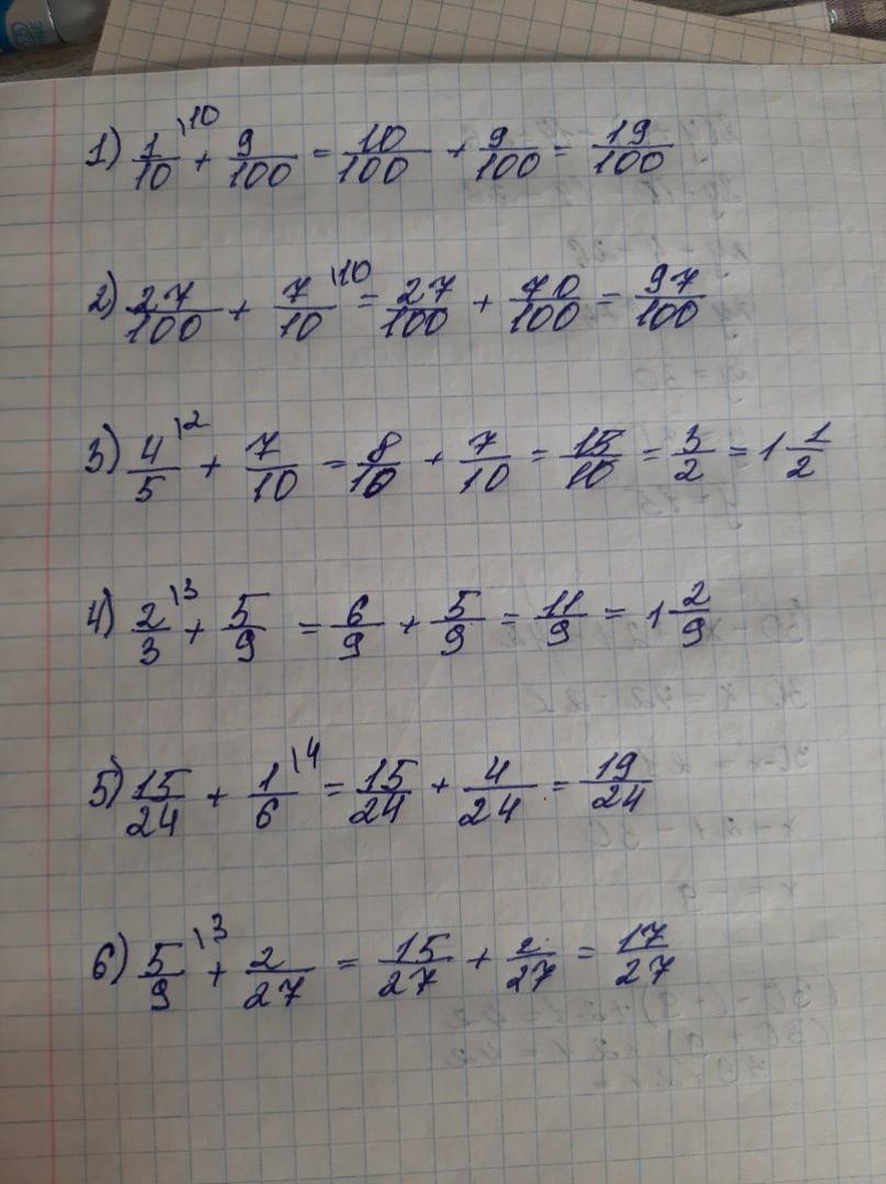 Выполните сложение: 1) 1/10+9/100, 2)27/100+7/10, 3) 4/5+7/10,4) 2/3+5/9,5) 15/24+1/6,6)5/9+2/27