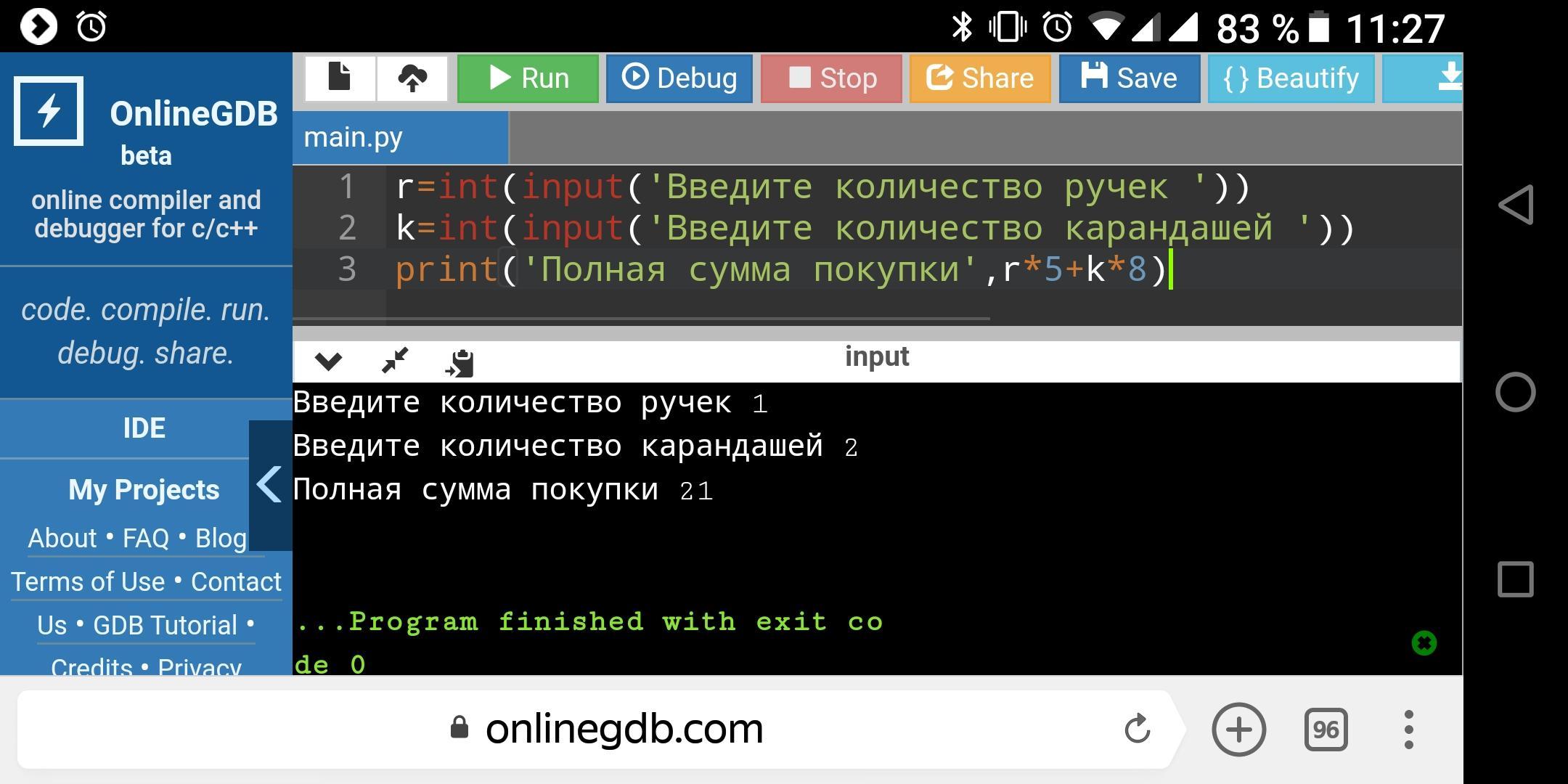 1 ручка стоит 5 рублей, 1 карандаш стоит 8 рублей, напишите программу, в которой будет спрашиваться количество ручек, количество карандашей и полная сумма покупки