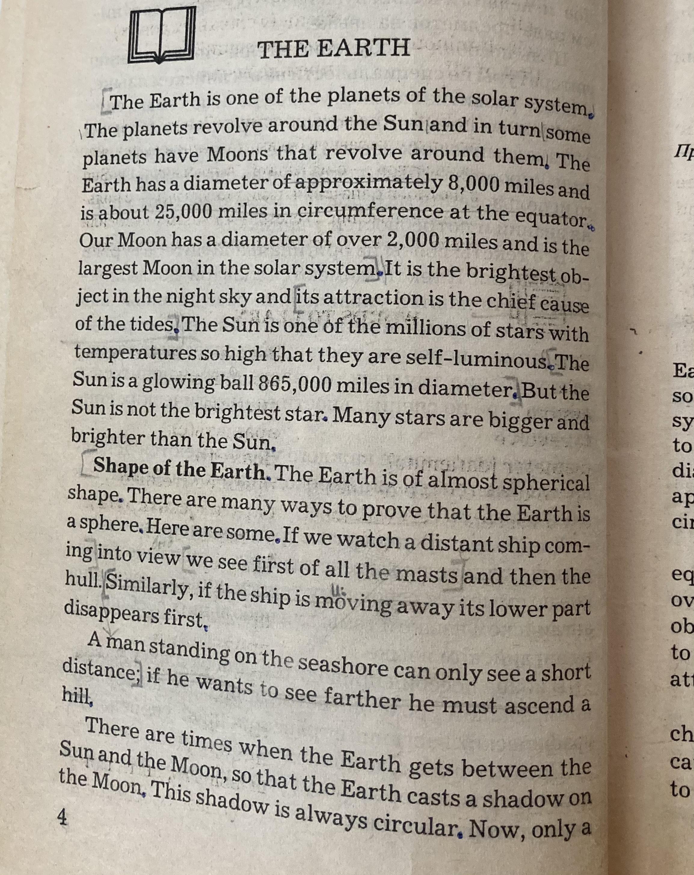 ЗЕМЛЯ Земля - одна из планет солнечной системы. Планеты вращаются вокруг Солнца, и, в свою очередь, у некоторых планет есть Луны, которые вращаются вокруг них. Земля имеет диаметр примерно 8000 миль и около 25000 миль в окружности на экваторе. Наша Луна имеет диаметр более 2000 миль и является самой большой Луной в Солнечной системе. Это самый яркий объект на ночном небе, и его притяжение является главной причиной приливов. Солнце - одно из миллионов звезды с такой высокой температурой, что они самосветящиеся, Солнце - это светящийся шар диаметром 865 000 миль, но Солнце не самая яркая звезда. Многие звезды больше и ярче Солнца, формы Земли. Земля имеет почти сферическую форму. Есть много способов доказать, что Земля - это сфера. Вот некоторые из них. Если мы наблюдаем за приближающимся далеким кораблем, мы сначала видим мачты, а затем корпус. Точно так же, если корабль удаляется, его нижняя часть исчезает первой. Человек, стоящий на берегу моря, может видеть только на небольшом расстоянии; если он хочет видеть дальше, он должен подняться на холм. Бывают моменты, когда Земля оказывается между Солнцем и Луной, так что Земля отбрасывает тень на Луну. Эта тень всегда круглая. Теперь только 4