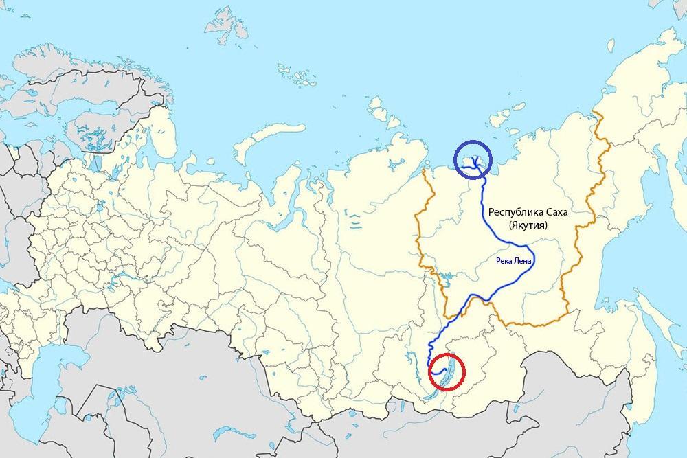 3. Определим, где исток и устье реки. Исток реки Лена расположен в озере Нэгэдьээн (пик Байкальского хребта), которое находится недалеко от Байкала (обведено на карте красным кружочком). Река Лена впадает в море Лаптевых (Северный Ледовитый океан) и создаёт в своём устье крупную дельту (обведено на карте синим кружочком).