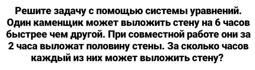 При совместной работе они половину стены выложат за 2 часа ⇒