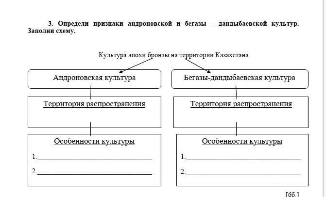 Определи признаки андровской культуры и бегазы-дандыбаевской культур Заполни схему.
