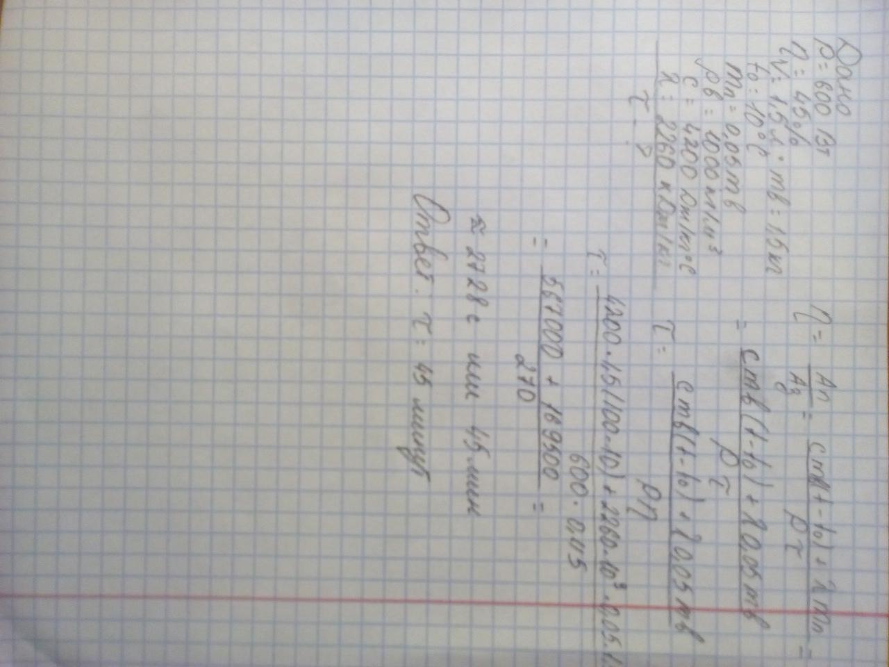 5. На электроплитке мощностью 600Вт с КПД=45% нагрели до кипения 1,5 л воды, взятой при 10°С, при этом 5% воды превратилось в пар. Сколько времени длилось нагревание?