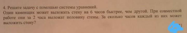 При совместной работе они половину стены выложат за 2 часа ⇒