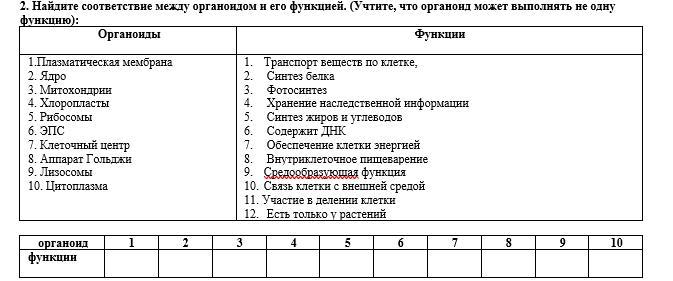 Найдите соответствие между органоидом и его функцией. (Учтите, что органоид может выполнять не одну функцию)