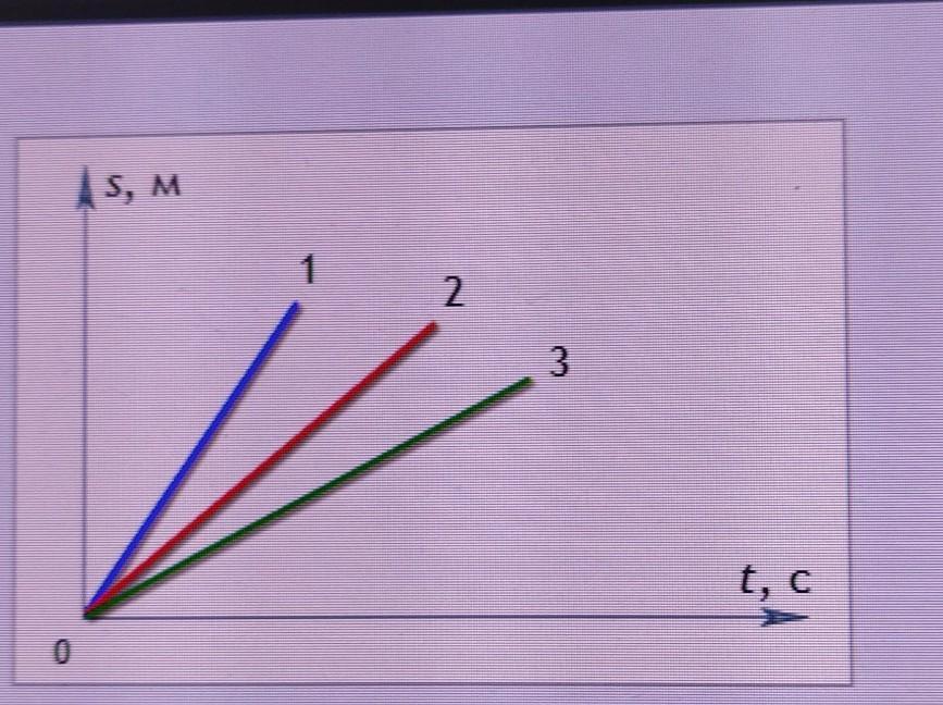 На рисунке представлены три графика зависимости пройденного пути от времени. Какое из тел двигалось с меньшей скоростью?