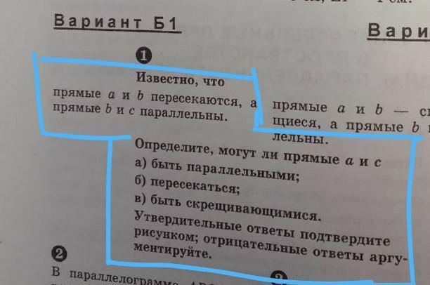 Значит, а║b. Но по условию прямые а и b пересекаются. Следовательно предположение неверно. Прямые а и с не могут быть параллельны.