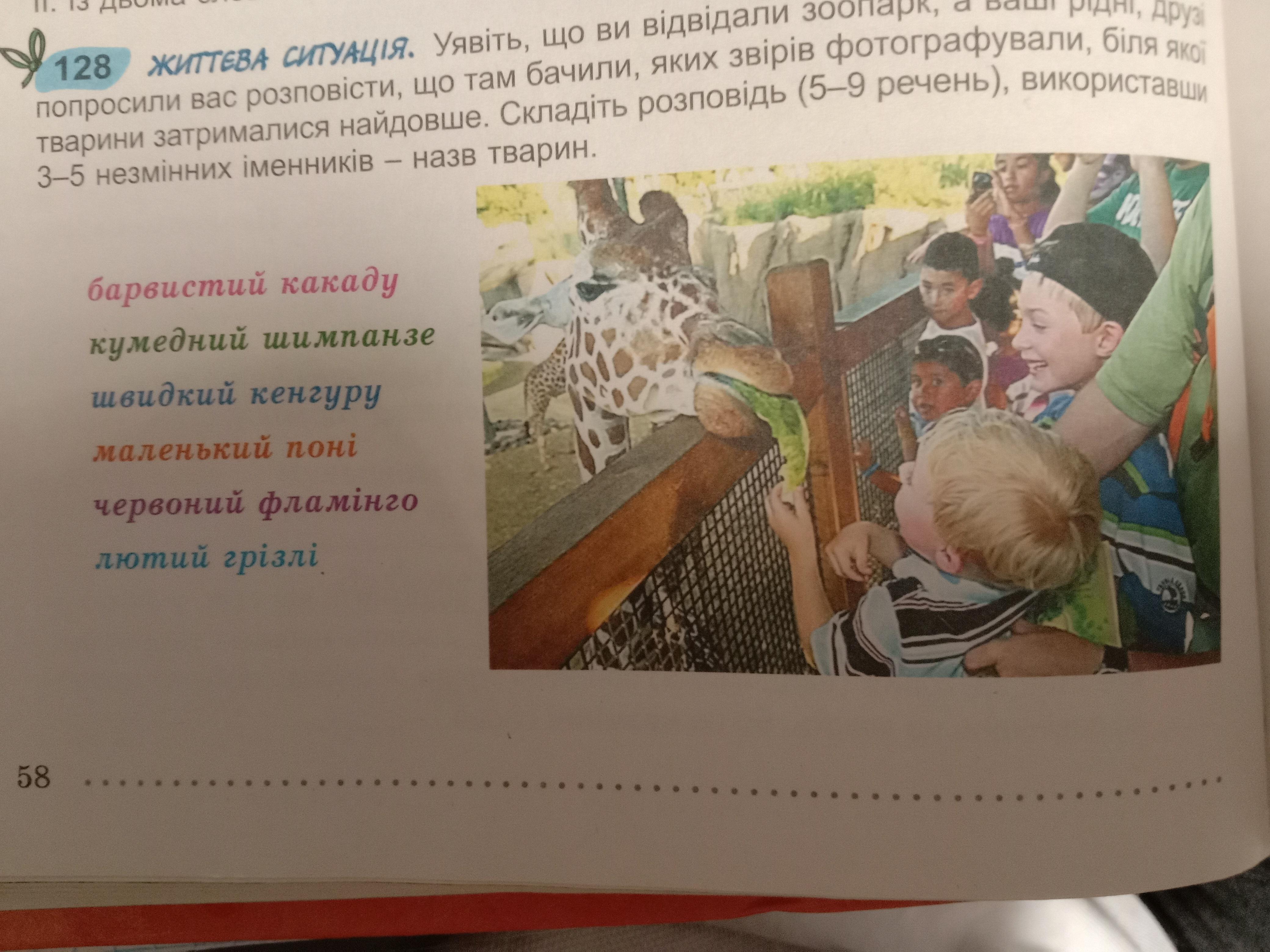 Сьогодні я відвідала зоопарк.Я бачила багато різних звірів, барвистого какаду, фотогруфувала кумедних шимпанзе.Там також був швидкий кенгуру та маленький поні.Більш всьго мені сподобався червоний фламінго та лютий грізлі!Там було дуже круто!