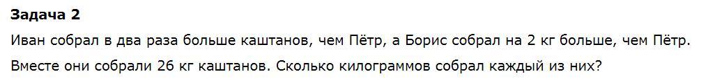 Иван собрал в два раза больше каштанов, чем Пётр, а Борис собрал на 2 кг больше, чем Пётр. Вместе они собрали 26 кг каштанов. Сколько килограммов собрал каждый из них?