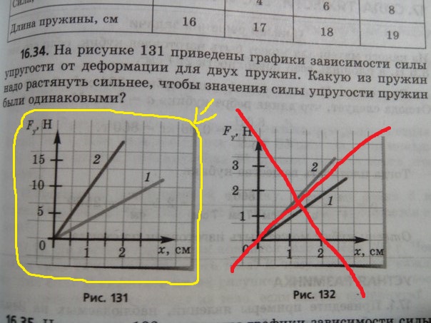 Например сила упругости равна 10.Берёшь и проводишь прямую y=10. Она пересекает 2 график в некоторой точке, из это точки опускаем перпендикуляр вниз на ось ох и смотрим,что растяжение равно 10. Аналогично для 1 графика,и выясняем, что растяжение равно 2,75(примерно)