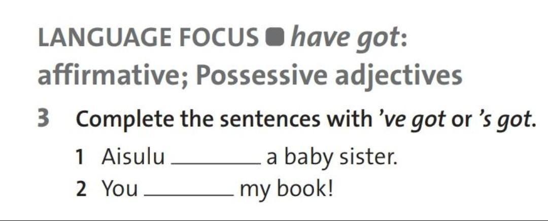 1 Aisulu has got a baby sister. 2. You`ve got my book!
