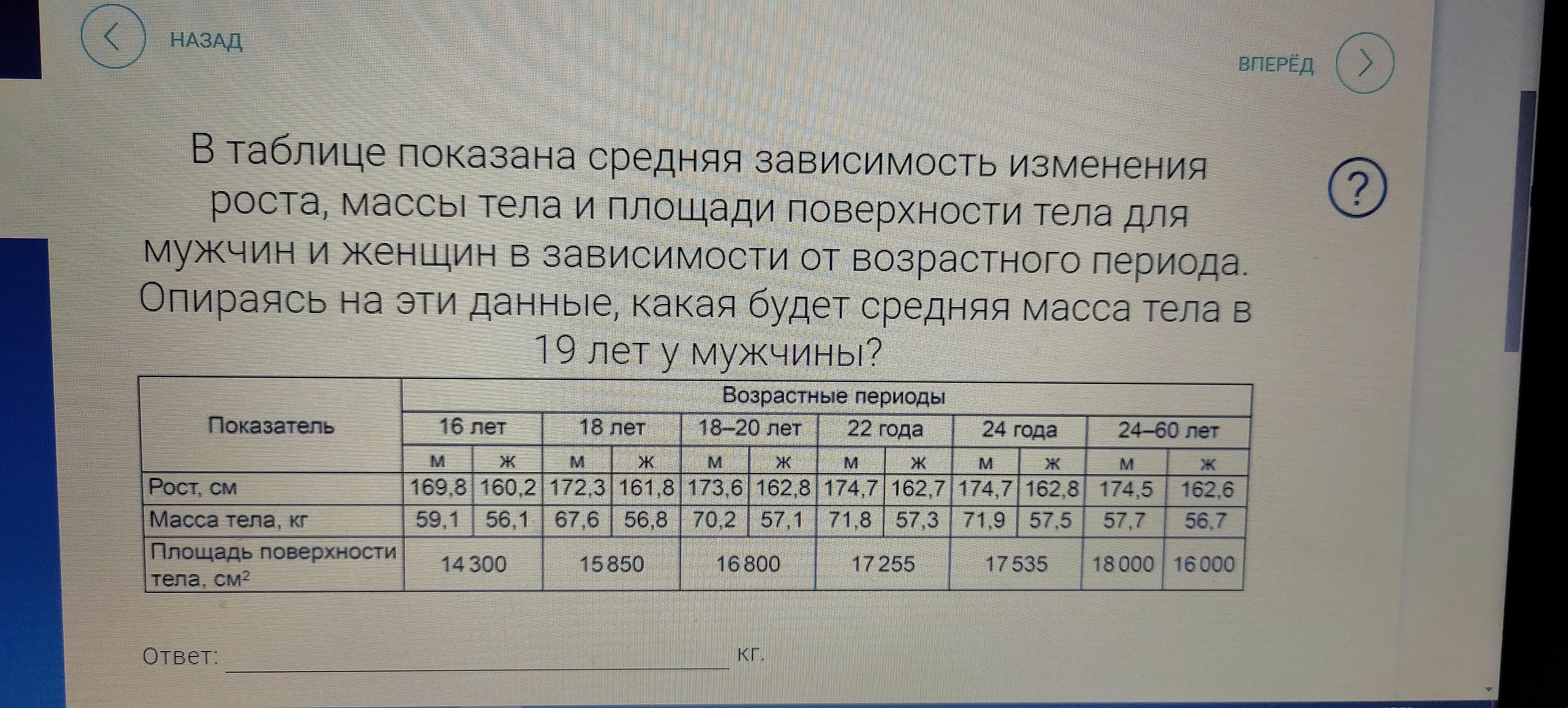 Элементарно же, тут даны возрастные периоды. 19 лет-это возраст от 18 до 20 лет. Слева в столбце даны данные, по строке массы тела, в этой возрастной группе написано что масса тела составляет 70,2кг.