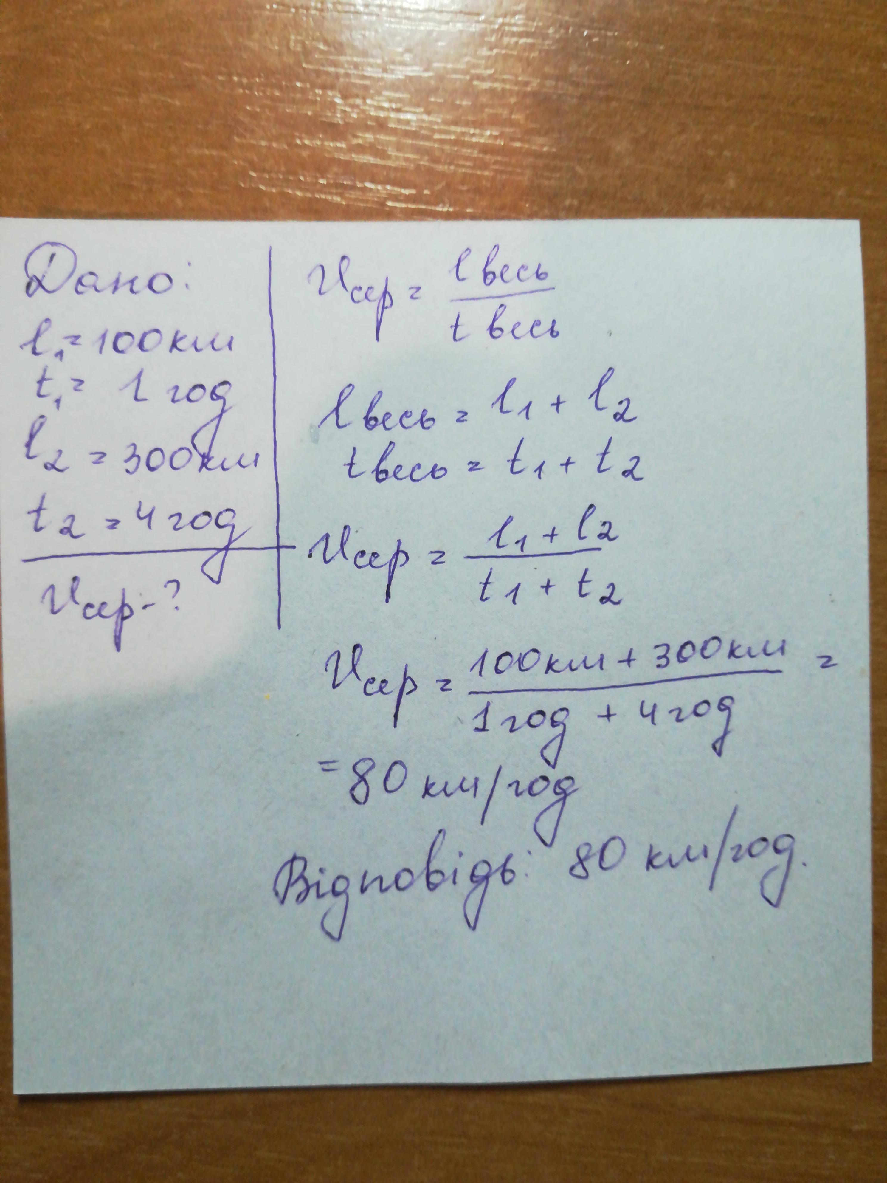 Автомобіль проїхав 100км за 1год а потім ще 300км за 4 год.Яка середня швидкість автомобіля на всьому шляху? срочно даю 30балів