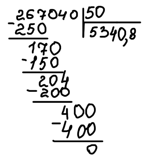 Мы делим на 50 , берем числа по порядку : 2 - не подходит , 26 тоже , 267 , ага оно делиться на 50 - получается 5 , остается 17 . Берем следующее число 17 - мало , 170 делиться на 50 , получается 3 , остаток 20 и т.д.