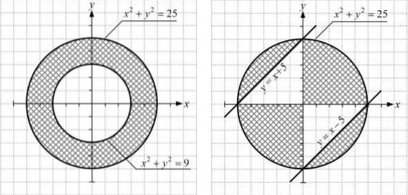 if ((x * x + y * y <= 25) and (y > x + 5)) or ((x * x + y * y <= 25) and (y < x - 5)) \