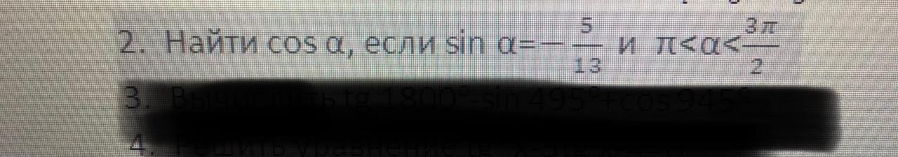 sin\alpha =-\frac{5}{13}\\sin^2\alpha +cos^2\alpha =1\\cos\alpha =^+_-\sqrt{1-sin^2\alpha } \\cos\alpha =^+_-\sqrt{1-\frac{25}{169} }=^+_-\frac{12}{13}\\ \pi   <\alpha <\frac{3\pi }{2} - III chetvert,=>cos\alpha   <0\\cos\alpha =-\frac{12}{13}