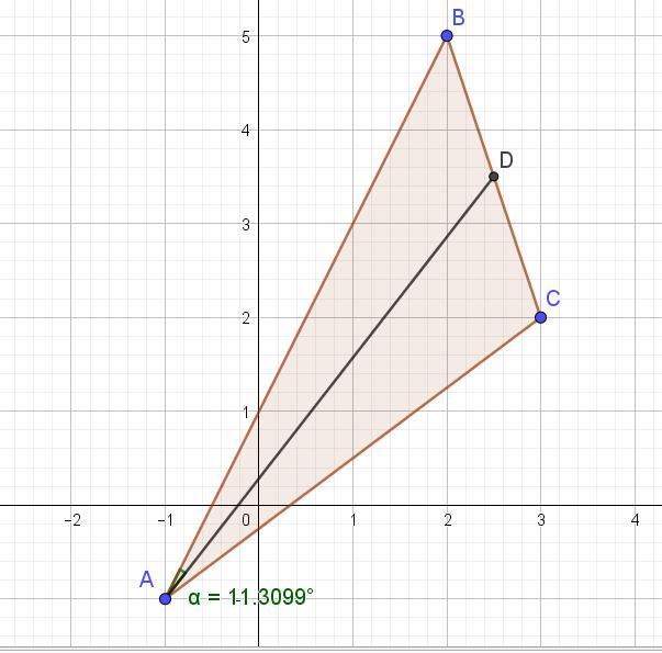 Находим координаты точки М как середину стороны ВС. B( 2,5 ), C( 3,2 )