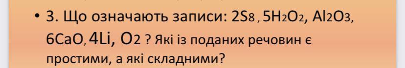 прості речовини : 2S8, 4Li, O2. Складні речовини: 5H2O2, Al2O3, 6CaO