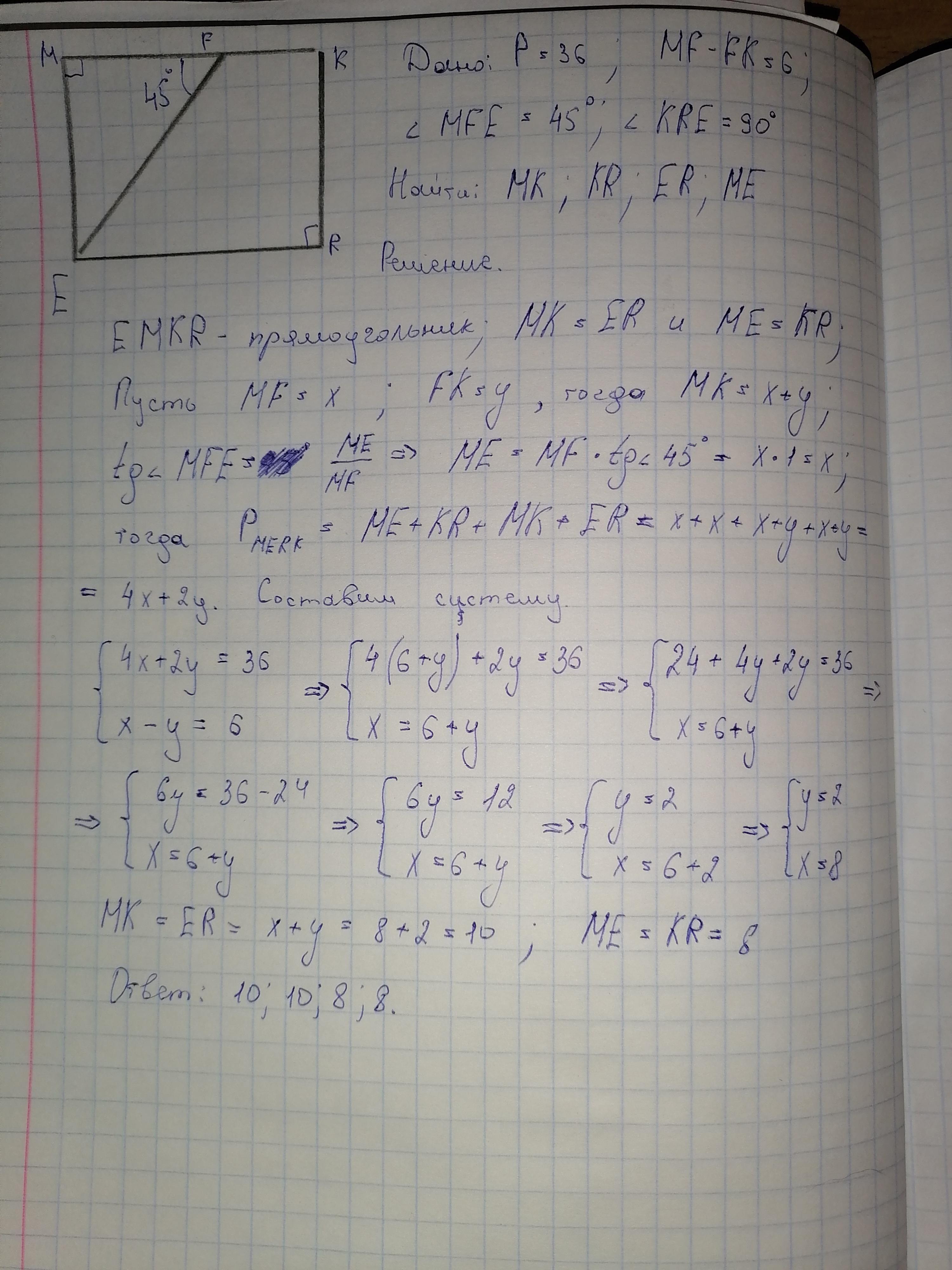 МЕ=х. FK=у. Система уравнений {х-у=6 {2х+у=36:2