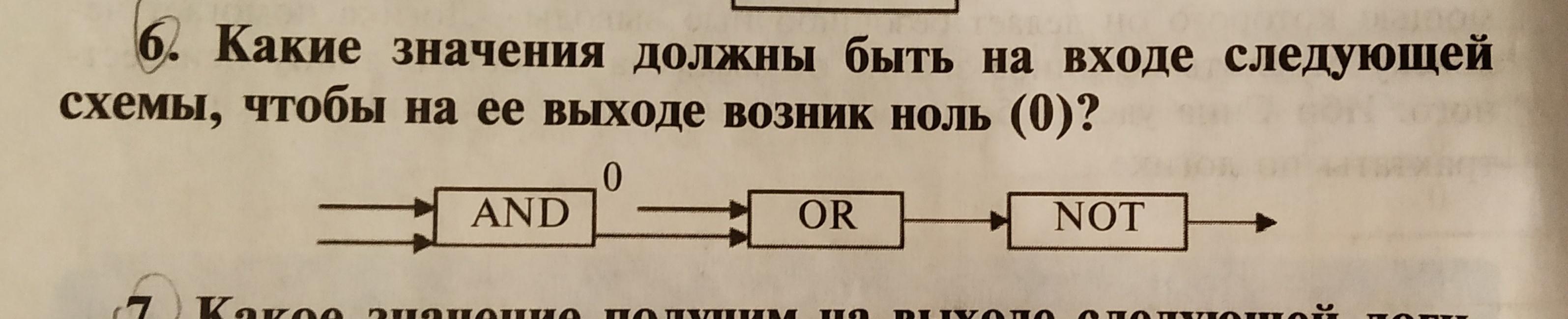 Значит с элемента OR (ИЛИ) должна придти 1. Единицу мы с него получим если на на одном ИЛИ другом (или на обеих) входах будет единица. Но на одном входе уже нарисован 0. Значит на втором входе, который после AND (И) должна быть 1. AND даст нам единицу, только если на каждом его входе будет 1. Значит на вход схемы нужно подать на оба входа по 1