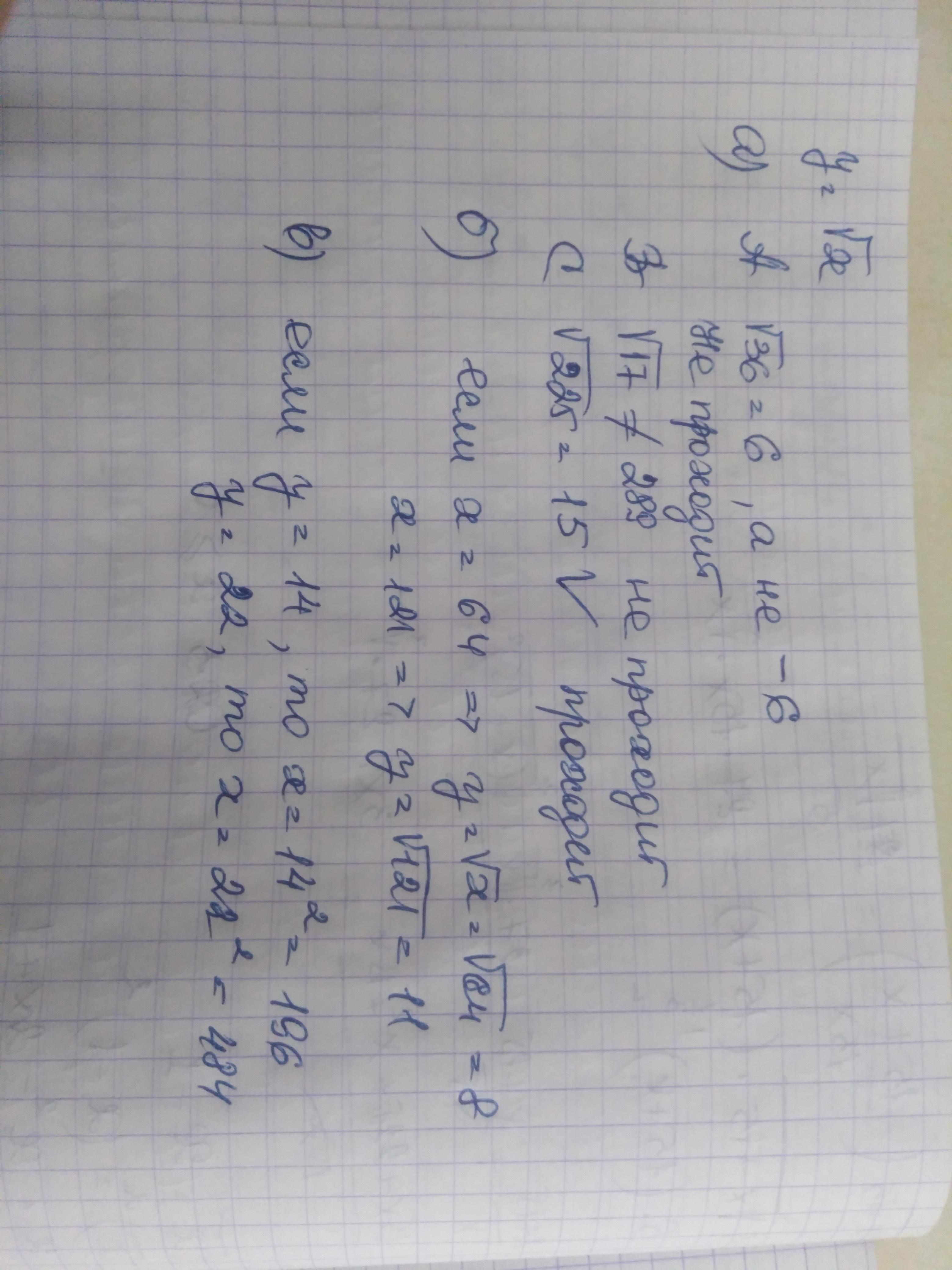 Дана функция у= √х.а) Проходит ли график этой функции через точки А (36; -6), В (17; 289), С(225; 15)?б) Какие значения будет принимать данная функция, если х [64; 121]в) Найдите значения аргумента, если у [14; 22]