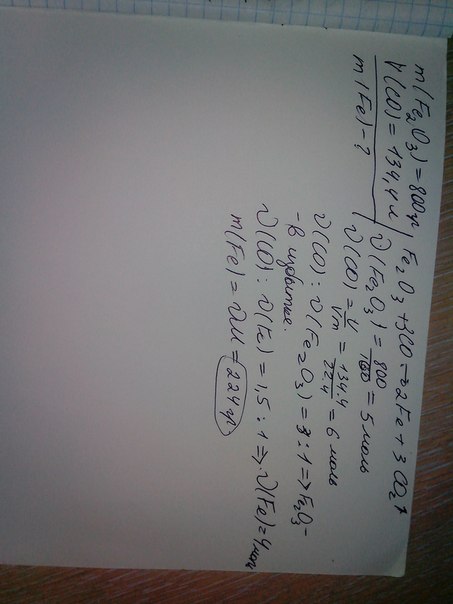 Сколько грамм железа получим при взаимодействии 800 грамм ферум (3) оксида и 134.4 литра карбон (2) оксида?