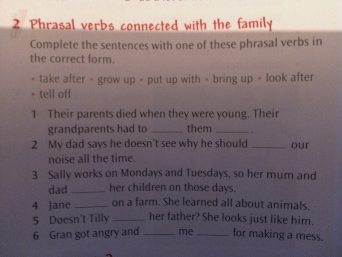 1 bring them up 2 put up with 3 look after 4 grew up 5 take after 6 told off